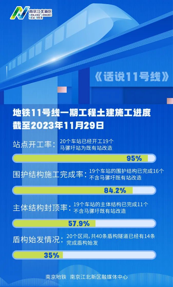 截至2023年11月29日,11号线一期工程20座车站,已经开工19座,马骡圩站暂未开工,相关手续正在办理中。其中,16座车站完成了围护结构的施工,3座车站正在进行围护结构施工。在16座完成围护结构施工的车站中,有11座车站的主体结构已经封顶。