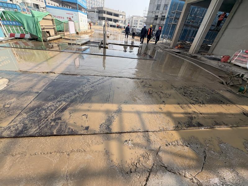 沿山大道161项目:道路及钢板保洁不到位,裸土覆盖不到位,污水漫溢。