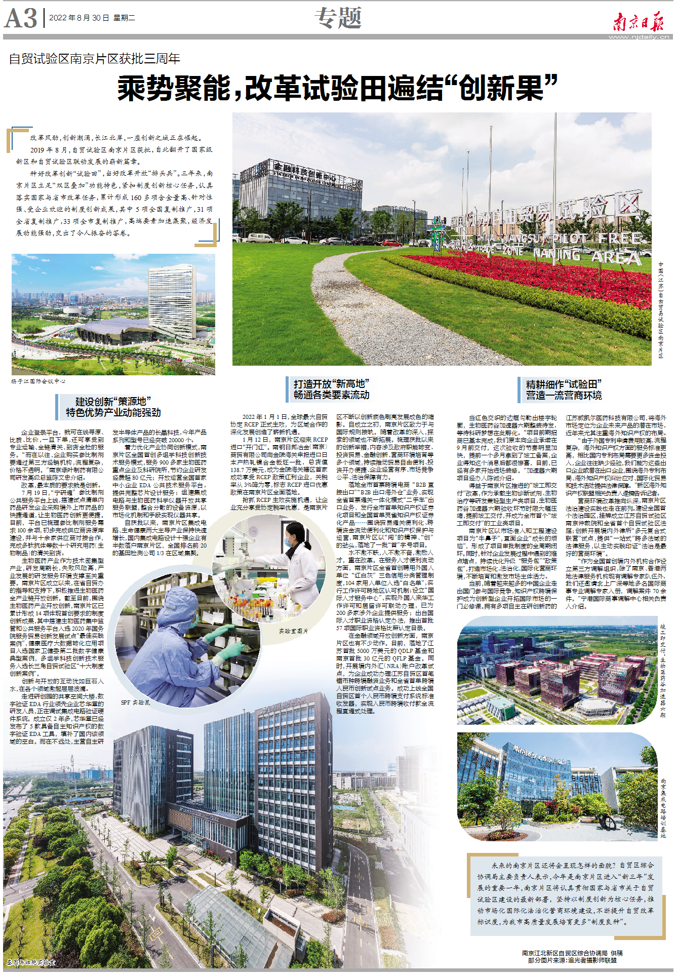 种好改革创新“试验田”,当好改革开放“排头兵”。三年来,南京片区立足“双区叠加”功能特色,紧扣制度创新核心任务,认真落实国家与省市改革任务,累计形成160多项含金量高、针对性强、受企业欢迎的制度创新成果,其中5项全国复制推广,31项全省复制推广,33项全市复制推广,高端要素加速集聚,经济发展动能强劲,交出了令人振奋的答卷。