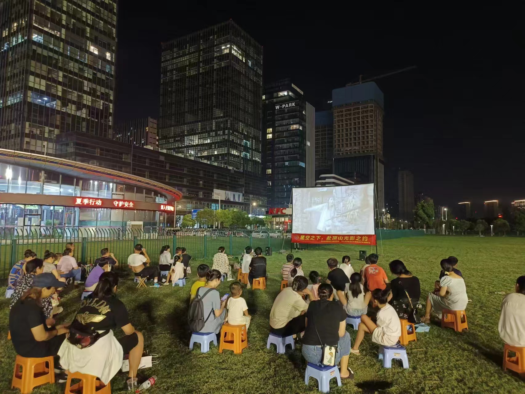 夏日的夜晚光影交织。每当吃过晚饭,顶山的居民们便陆陆续续提上小板凳,前往家门口的广场——赴“光影之约”。当白色的幕布亮起,记忆中那个摇着蒲扇、听着蝉鸣的童年仿佛回来了。大家三五成群地围坐在一起,在看观影中不时低语,共叙邻里情谊。