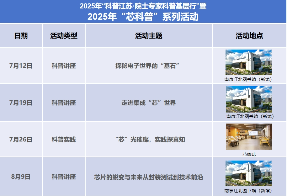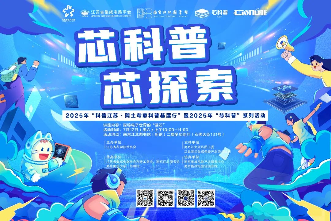 7月12日上午,2025年“科普江苏·院士专家科普基层行”暨2025年“芯科普”系列活动首场科普讲座将正式启动,一起来探秘电子世界的“基石”吧。