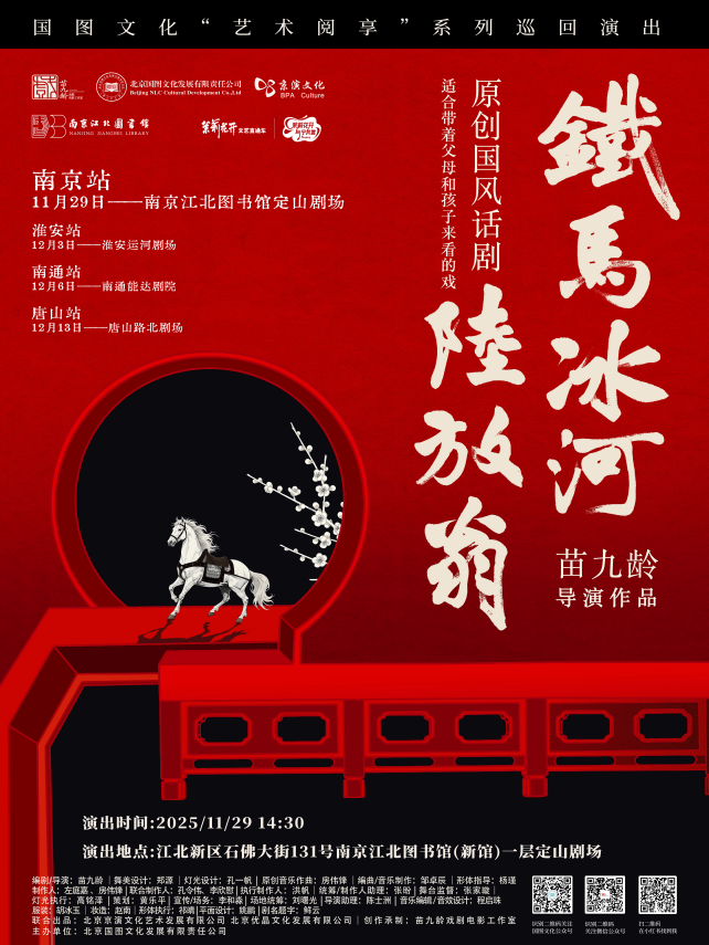 2025年11月29日(周六)14:30,在南京江北图书馆(新馆)一层定山剧场,由苗九龄戏剧电影工作室创作承制的原创国风话剧《铁马冰河陆放翁》即将上演!该剧讲述了南宋伟大诗人陆游的一生,以他的爱国情怀、诗歌创作和个人情感为主线,展现了一个在民族危机中不屈不挠的灵魂。