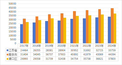 表1 2017年—2024年江苏省、南京市、浦口区城乡居民收入增长情况表