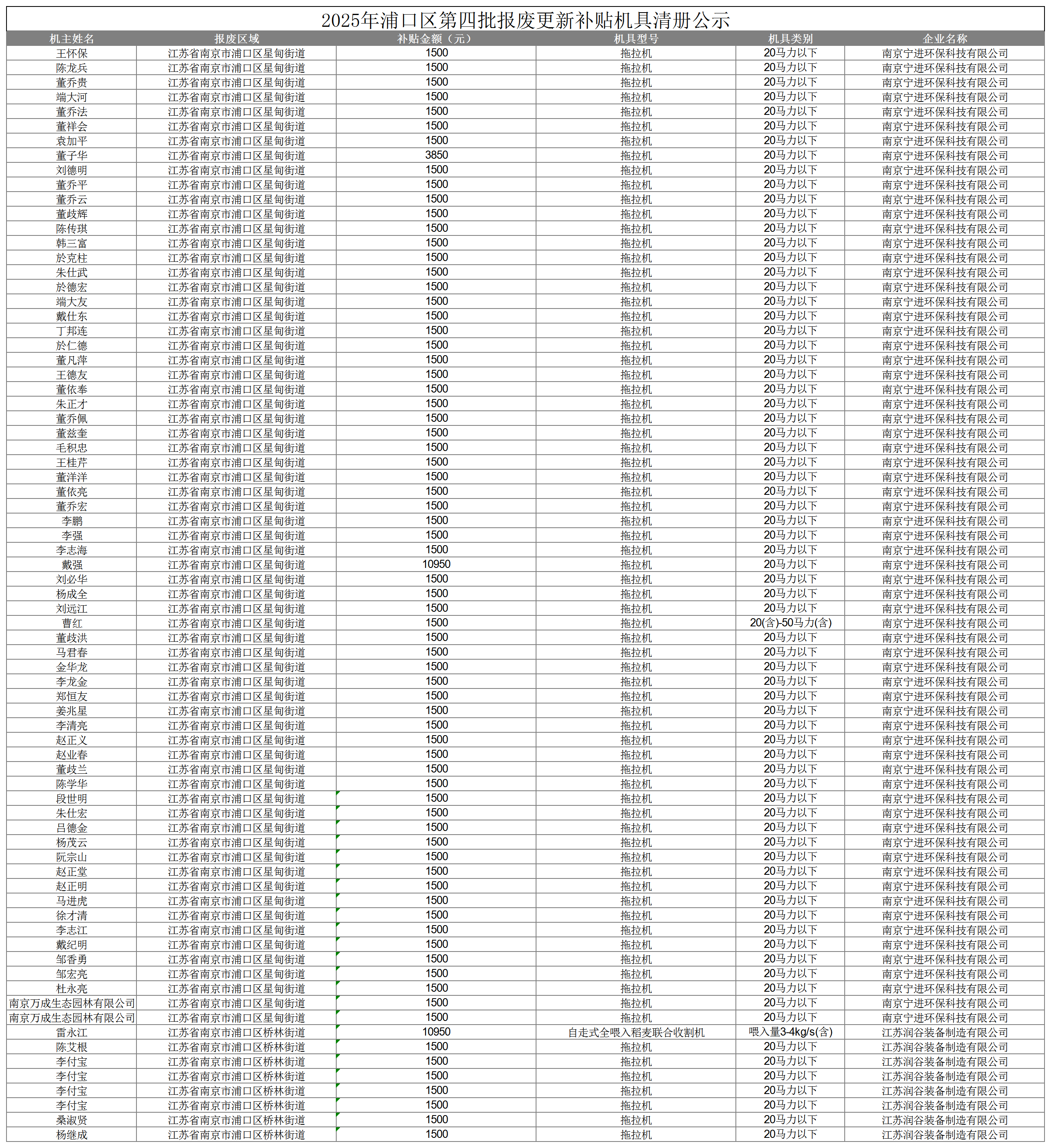 2025年浦口区第四批农机报废更新补贴机具清册公示