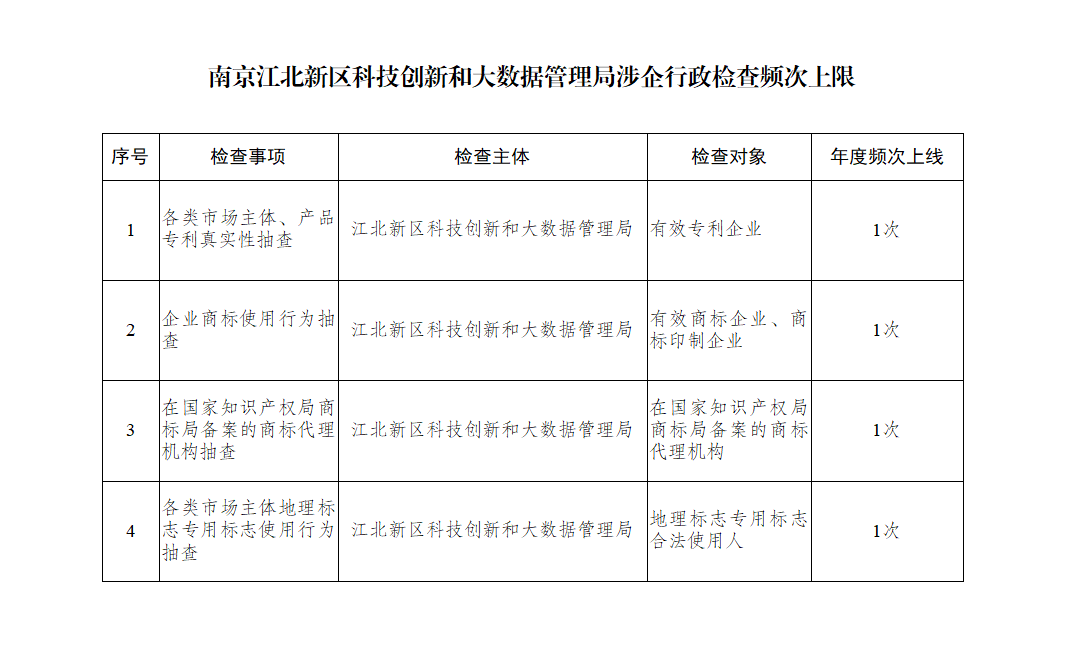 南京江北新区科技创新和大数据管理局涉企行政检查频次上限