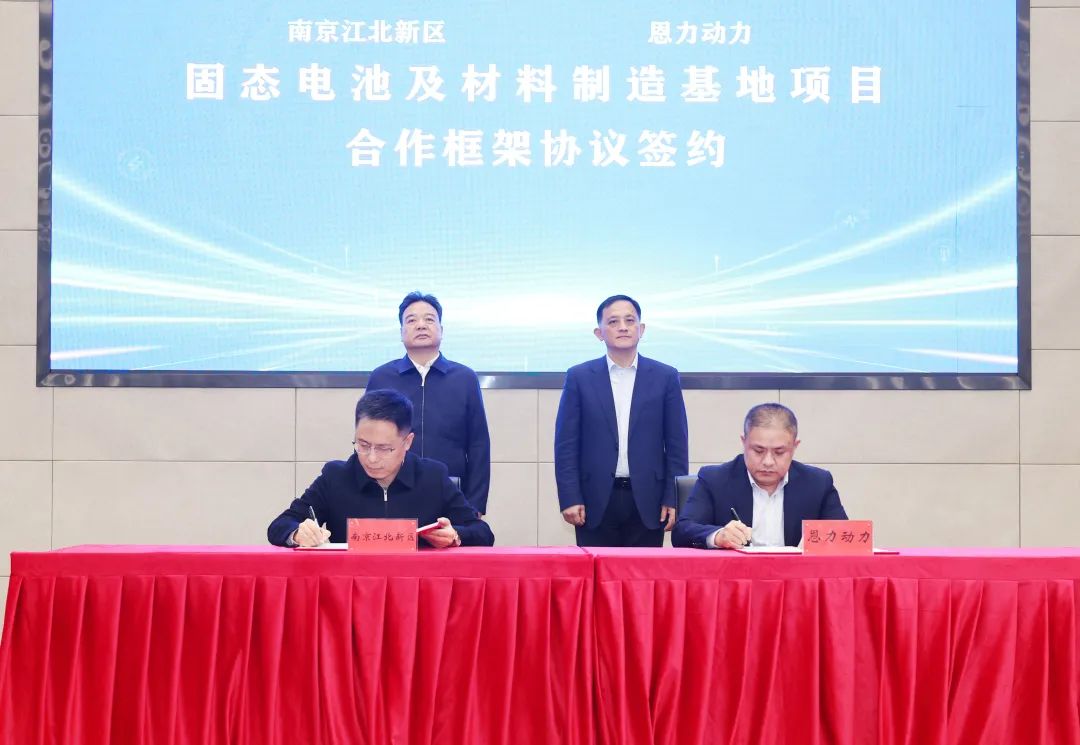 活动上,江北新区与恩力动力签署固态电池及材料制造基地项目合作框架协议,新材料科技园与恩力动力签署固态电池及材料制造基地项目入园协议。根据合作协议,恩力动力将在新区布局建设千吨级硫化物固态电解质材料、固态电池及pack电池包制造生产基地,并设立固态电池领域研发测试中心。