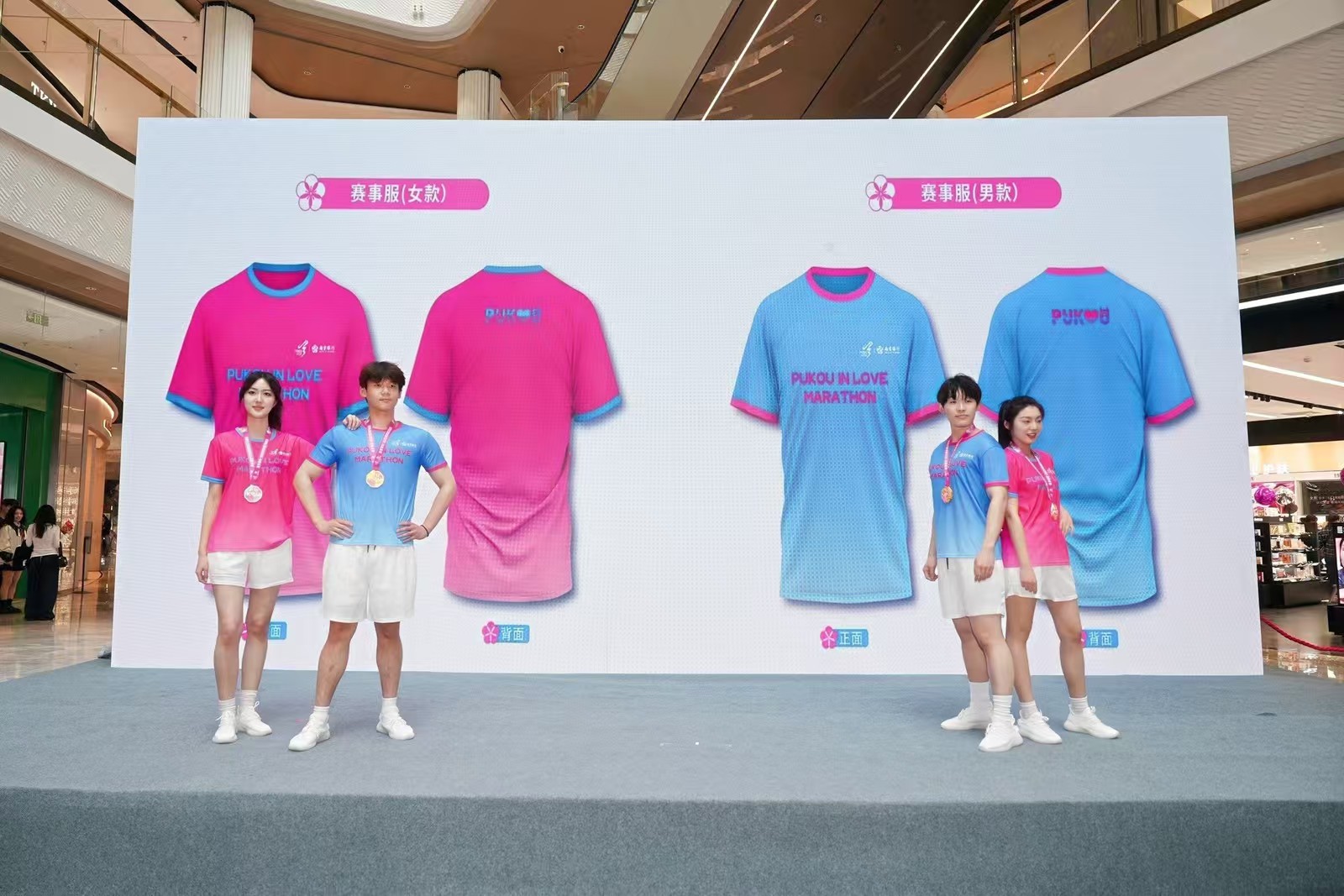 主持人:赛事服分为男女款,男款以渐变蓝为主要色调,女款以渐变玫红色为主色调,两款颜色在领口与袖口处互为映衬,增添视觉冲击力。总体设计简洁大方,背面精心以爱心图案与“南京浦云路大桥”剪影为设计元素,构成了“浦口”的拼音设计,体现南京浦口马拉松的地域特色。面料上主要采用轻薄透气的速干面料,提供舒适的运动体验。