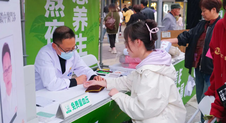 除了常规义诊,更多的特色医疗服务也走进商圈,弘阳广场“脆皮青年养生局”中医药文化市集就吸引了不少市民咨询。市集中,中医师们化身“摊主”,通过中医把脉、针灸、推拿、体质辨识等多种形式,为市民提供免费的健康服务。此外,现场还展示了药膳美食、中医食养茶、养生文创产品等,吸引了大量市民驻足体验。