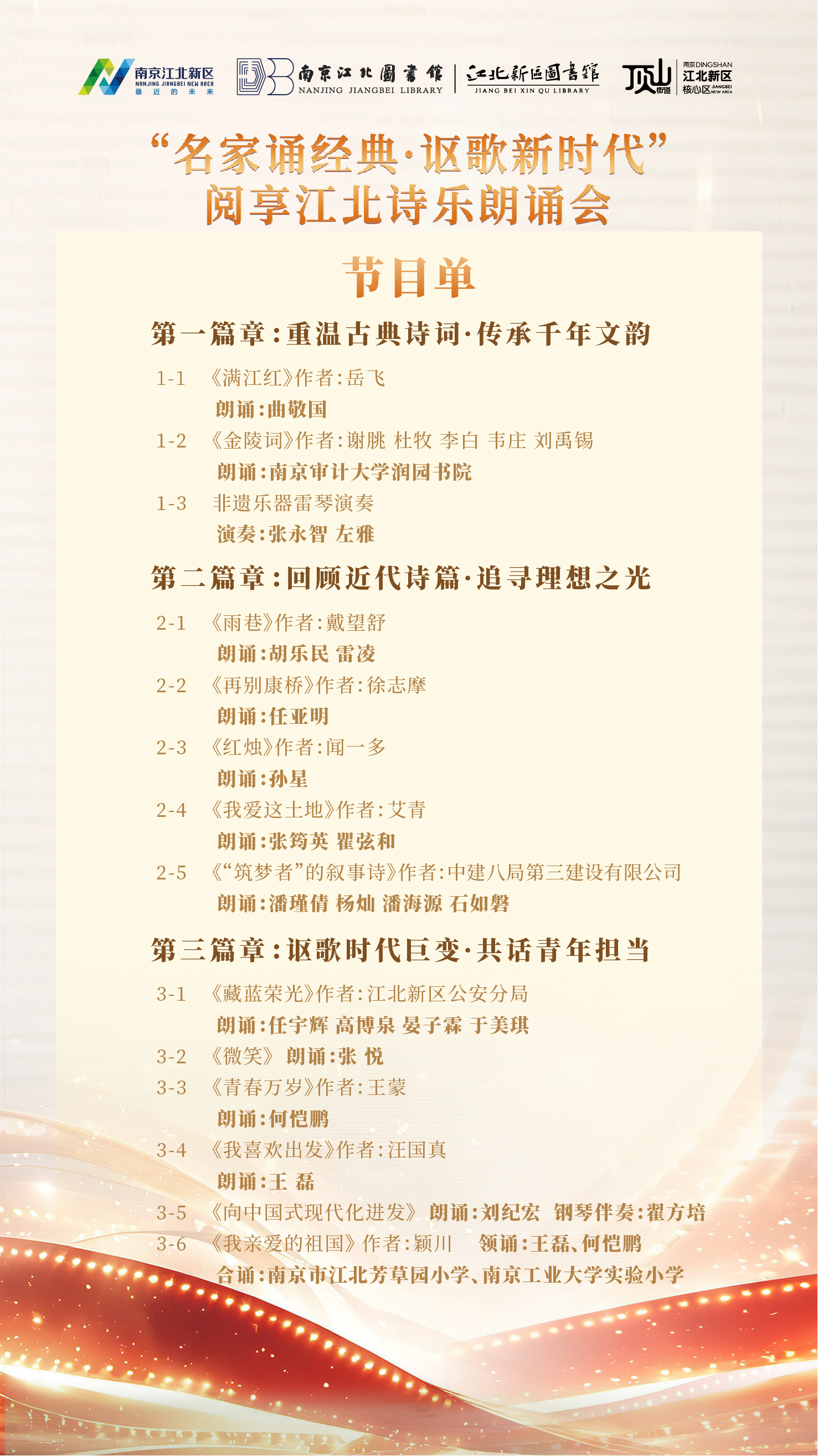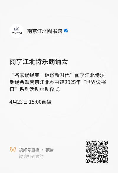长江之畔诗乐声,青春之城传经典。为弘扬中华民族精神,传承中华文化经典,推动国家级优质文化资源直达新区,南京江北图书馆将于4月23日下午隆重举行“名家诵经典·讴歌新时代”阅享江北诗乐朗诵会暨南京江北图书馆2025年“世界读书日”系列活动启动仪式,为群众呈上文化大餐,点燃全民阅读的燎原之火,让“青春江北”成为传承中华文脉的闪亮名片。