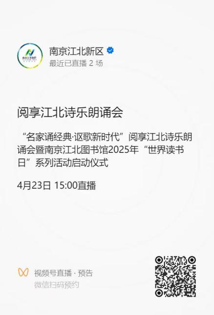 4月23日活动当天,还将举行南京江北新区“馆校共建・文教同行”授牌仪式、2025年度“书香江北·全民阅读推广大使”聘任仪式,以及南京江北图书馆2025年“世界读书日”系列活动启动仪式,敬请期待!