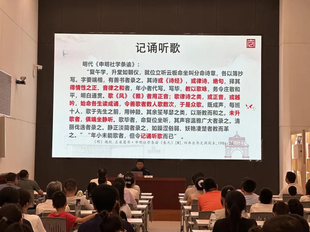 陈亮馆长的讲座从江北的历史文脉徐徐展开,以“诗@歌”“岁@年”“闰@平”与“缺@圆”的精妙对举为引,带领听众走进一个声情并茂的诗词世界。他独具匠心地将诗歌与时间的关系娓娓道来,从《尚书》“诗言志,歌永言”的古老智慧,到明代《申明杜学条谕》中“记诵听歌”的生动场景,层层递进地揭示了中国诗歌与音乐同源共生的本质。